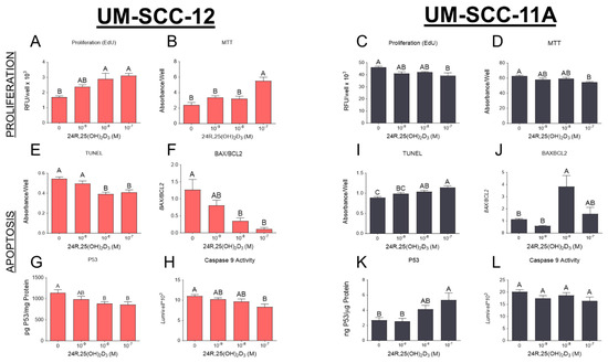 Analysis of 24R,25(OH)2D3 effect on markers of tumor growth and apoptosis. UM-SCC-12 and UM-SCC-11A cells were treated with vehicle, 10−9 M, 10−8 M, or 10−7 M 24R,25(OH)2D3 for 15 min, and then media were replaced with fresh media without the vitamin D metabolite for 20 h to perform the EdU assay in UM-SCC-12 cells (A). The MTT assay was performed 24 h after the treatment of UM-SCC-12 cells (B). UM-SCC-11A cells were assessed for EdU incorporation 20 h after treatment (C). The MTT assay was performed 24 h after UM-SCC-11A cells were treated with 24R,25(OH)2D3 (D). A TUNEL assay was used to measure DNA fragmentation 24 h after treatment in UM-SCC-12 cells (E). The gene expression of the ratio between BAX and BCL2 was assessed in UM-SCC-12 cells 12 h after treatment (F). p53 protein levels were measured using ELISA in UM-SCC-12 cells (G) 24 h after treatment. Caspase 9 activity was measured in UM-SCC-12 cells 24 h after treatment (H). Similar measurements were made in UM-SCC-11A cells for TUNEL (I), BAX/BCL2 mRNA ratio (J), p53 levels (K), and Caspase 9 activity (L). Data are presented as the mean ± standard error of n = 6 independent cultures per group. Groups not sharing a letter are statistically different at p < 0.05 by means of one−way ANOVA with a Tukey post-test.