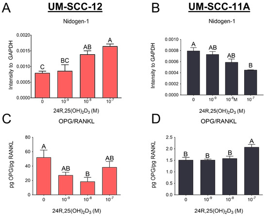 Analysis of 24R,25(OH)2D3 effect on markers of metastasis. The Western blot analysis of lung metastasis marker, Nidogen-1, was performed 24 h after treatment in UM-SCC-12 cells (A) and UM-SCC-11A cells (B). The effect of 24R,25(OH)2D3 on the osteoclast activity indicator OPG/RANKL ratio was measured using ELISAs 24 h after treatment in UM-SCC-12 cells (C) and UM-SCC-11A cells (D). Groups not sharing a letter are statistically different at p < 0.05 by means of one-way ANOVA with a Tukey post-test. Data are presented as the mean ± standard error of n = 6 independent cultures per group. Data are from a single experiment; all experiments were repeated to ensure the validity of the results.