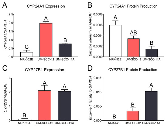 Baseline analysis of enzymes 1α-hydroxylase and 24-hydroxylase. Baseline mRNA expression levels of 24-hydroxylase/CYP24A1 (A) measured 12 h after final feedings, and protein levels measured by means of Western blot in NRK-52E, UM-SCC-12, and UM-SCC-11A cells 24 h after the final feeding (B). Gene expression of 1a-hydroxylase/CYP27B1 measured using RT qPCR (C) and protein levels measured by means of Western blot (D). Gene expression data are presented as the mean ± standard error of n = 6 samples per group while the Western blot analysis has n = 3 per group. Groups not sharing a letter are statistically different at p < 0.05 by means of one-way ANOVA with a Tukey post-test.
