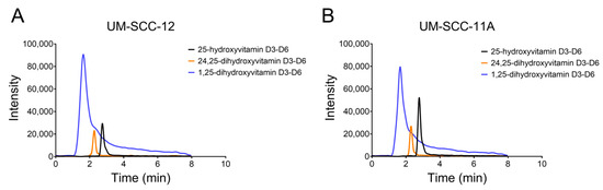 HPLC-MS analysis of 24,25(OH)2D3 production. Peak analysis of 25-hydroxyvitamin d3–d6, 1,25-dihydroxyvitamin d3–d6, and 24,25-dihydroxyvitamin d3–d6 observed in UM-SCC-12 cells (A) and UM-SCC-11A cells (B).