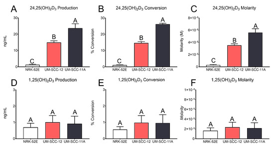 The elution times for vitamin D3 metabolites in our system are presented in Supplementary Figure S1. The peak analysis of all measured metabolites in cultures of both UM-SCC-12 (Figure 5A) and UM-SCC-11A (Figure 5B) cells shows a clear separation between the vitamin D3 metabolites. After treatment with 25(OH)D3 for 24 h, conditioned media were assessed by means of HPLC for 1,25(OH)2D3 and 24,25(OH)2D3 production. NRK-52E cells produced significantly less 24,25(OH)2D3 than UM-SCC-12 cells and UM-SCC-11A cells. UMSCC-11A cells produced the most 24,25(OH)2D3 at approximately 23 ng/mL 24,25(OH)2D3, while UM-SCC-12 produced about 15 ng/mL (Figure 6A). This led to a 1%, 14.6%, and 26% conversion of 25(OH)D3 to 24,25(OH)2D3 in NRK-52E, UM-SCC-12, and UM-SCC-11A cells, respectively (Figure 6B). While NRK-52E cells produced about 10−9 M 24,25(OH)2D3, UM-SCC-12 and UM-SCC-11A cells produced significantly more with 3.5 × 10−8 M and 5.6 × 10−8 M, respectively (Figure 6C). All three cell types produced similar levels of 1,25(OH)2D3, with approximately 1ng/mL measured in the media (Figure 6D). About 1% of the treated 25(OH)D3 was converted into 1,25(OH)2D3, equating to about 2 × 10−9 M 1,25(OH)2D3 (Figure 6E,F).