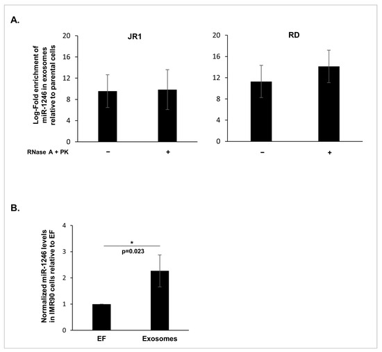 We have previously demonstrated that exosomes derived from both JR1 and RD FN-RMS cells share enrichment in miR-1246 [12]. Since it has been observed that miR-1246 could be found abundantly outside extracellular vesicles, tightly associated with lipoproteins [25], we investigated whether the enriched exosomal miR-1246, as identified by microarray and RTq-PCR [12], was encapsulated within the RMS-derived exosomes. To address this question, exosomes were isolated from basal and untreated JR1 or RD cells, and then, only the exosomes were subjected to two conditions: (i) treatment with RNase and Proteinase K (PK) to eliminate any extravesicular RNA and protein, or (ii) left untreated (Figure 1A). We then performed Taqman RTq-PCR using RNA derived from the two exosomal conditions and their respective parental cells in order to detect the levels of enrichment of miR-1246 in the exosomes. These treatments did not affect miR-1246 levels observed in untreated exosomes and confirmed that miR-1246 was indeed enriched in the RMS-derived exosomes by at least 10-fold, and that miR-1246 was encapsulated inside FN-RMS-derived exosomes as part of their cargo (Figure 1A). Moreover, treating IMR90 cells with 10X JR1-derived exosomes resulted in a significant upregulation in miR-1246 levels (>2-fold) in recipient fibroblasts compared with control IMR90 cells cultured in EF media (Figure 1B). This observation suggests that exosomal miR-1246 is delivered and detected within recipient cells.