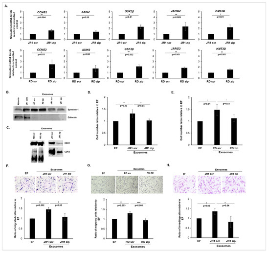 To determine the functional impact of exosomal miR-1246 on recipient cells, we collected exosomes following the functional inhibition of miR-1246 via transducing JR1 and RD cells, using a miRZip lentiviral vector encoding a mature full-length antisense microRNA specifically targeting miR-1246 (JR1-zip and RD-zip). This approach is known to functionally inhibit the target miRNA (miR-1246) without downregulating its expression levels, according to the manufacturer’s instructions. A scrambled vector with an identical backbone and a non-targeting shRNA sequence was used as the control (JR1-scr and RD-scr). The effectiveness of functional miR-1246 inhibition was evaluated through measuring the mRNA expression levels of previously validated miR-1246 targets (Supplementary Table S1), including CCNG2 [26,27,28], AXIN2 [29,30] and GSK3β [29,30], as well as putative miR-1246 targets identified using the TargetScan Database: JARID2 [31] and KMT2D. The results revealed a significant upregulation of all mRNA targets except AXIN2, whose upregulation tended to be significant in JR1-zip (Figure 2A; upper panel) and in RD-zip cells (Figure 2A; lower panel) relative to their respective scrambled controls (JR1-scr and RD-scr), indicating the successful functional inhibition of miR-1246 in our cellular models.