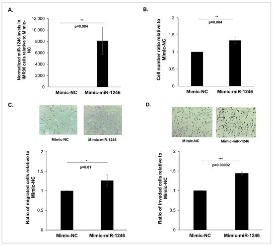 Since DOTAP liposomes have been recognized for exhibiting analogous characteristics to exosomes [32], and in order to understand the specific role played by miR-1246 alone in the observed effects of FN-RMS-derived exosomes on recipient fibroblasts, we used DOTAP liposomes to generate DOTAP-miRNA lipoplexes containing miR-1246 mimics. Figure 3A validates that treatment of IMR90 cells with DOTAP-miR-1246 mimics (Mimic-miR-1246) resulted in a significant upregulation in miR-1246 levels compared with cells treated with DOTAP-negative-control lipoplexes (Mimic-NC). Interestingly, delivery of miR-1246-mimic lipoplexes to IMR90 cells significantly enhanced their proliferation (Figure 3B), migration (Figure 3C), and invasion (Figure 3D) relative to IMR90 cells treated with negative control lipoplexes. It is important to note that despite the significant increase in miR-1246 levels in DOTAP-miR-1246-mimic-treated fibroblasts, we observed a slight but significant increase in proliferation, migration, and invasion of these cells compared with negative controls (mimic-NC). This discrepancy suggests that miR-1246 may have complex regulatory effects on cellular processes, and its functional impact may be influenced by various factors including cellular context, target availability, and downstream signaling pathways. Nevertheless, our findings suggest that miR-1246 alone can reproduce the effects of FN-RMS-derived exosomes on recipient cell behavior, underscoring the pivotal role of this miRNA as a key constituent within the FN-RMS exosomal cargo that enhances the aggressiveness of recipient cells.