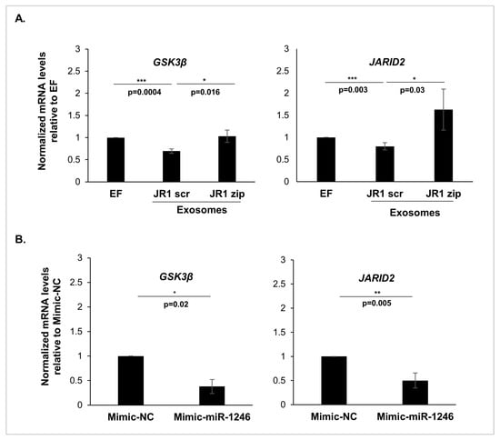 To investigate potential downstream signaling pathways that may elucidate the observed changes in recipient fibroblast behavior, we evaluated the expression levels of miR-1246 targets in IMR90 cells treated with either exosomes (Figure 4A) or DOTAP-miR-1246 mimics (Figure 4B). A significant downregulation in GSK3β and JARID2 mRNA levels was validated following treatment with JR1-scrambled derived exosomes (Figure 4A). This effect was reversed following the functional inhibition of miR-1246 in JR1 cells and treatment with the resulting exosomes (Figure 4A). Similarly, exposure of IMR90 cells to DOTAP-miR-1246 mimics resulted in a significant downregulation of GSK3β and JARID2 compared with those treated with DOTAP-negative control mimics (Figure 4B).