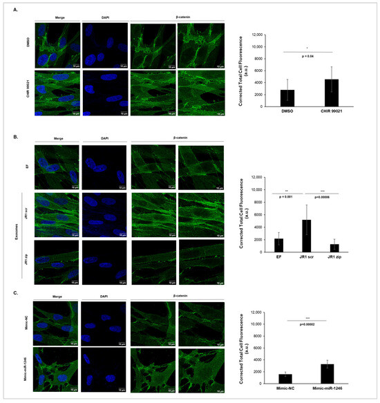 Cells were cultured on coverslips in 12-well plates and treated with 10× exosomes in 10% EF media or with DOTAP-negative control mimics or DOTAP-miR-1246 mimics at a final concentration of 25 nM in 500 µL serum-free media. As a positive control for active Wnt signaling, cells were treated with 3µM GSK3β inhibitor CHIR99021 (Sigma-Aldrich) or vehicle-control DMSO. After 48 h, cells were washed with PBS and fixed with 4% paraformaldehyde (Diapath S.p.A., Martinengo BG, Italy) for 15 min. Cells were then washed and permeabilized with 0.2% Triton X-100 (Sigma-Aldrich). Blocking was performed with 2% BSA for 1 h at room temperature. Cells were washed twice with PBS and each coverslip was incubated with primary antibody against total β-catenin (cat no. 8480, Cell Signaling Technology, Danvers, MA, USA), diluted 1:50 in PBS overnight at 4 °C. The next day, the cells were washed with PBS-0.01%Tween and incubated with Alexa Fluor 488 donkey anti-rabbit IgG (H + L) secondary antibody (Invitrogen) diluted 1:1000 in PBS for 1 h at room temperature. Cells were then washed with PBS-0.01% Tween and then counterstained and fixed on slides with DAPI-Fluoromount-G® (SouthernBiotech, Birmingham, AL, USA). Slides were observed at 40× magnification and images were captured using a Zeiss 880 confocal microscope. Pictures were then analyzed using ImageJ® software (ImageJ 1.54f). Corrected total cell fluorescence, in arbitrary units, was calculated as previously described [24].