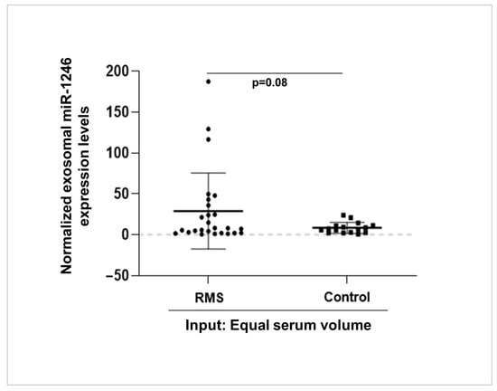 To assess the clinical relevance of our in vitro findings, we performed a pilot clinical investigation aiming at assessing the presence of exosomal miR-1246 in the sera of RMS patients. To achieve this, we isolated exosomes from the serum of 26 RMS patients as well as from 16 age-matched controls. The results exhibit a trend towards significance (p = 0.08), indicating potentially higher levels of miR-1246 in serum exosomes isolated from RMS patients compared with those from controls (Figure 6). Due to the small number of sera samples, no specific clinical features could be associated with the samples with increased expression in this cohort. While this finding requires validation in a larger and more comprehensive cohort, it implies a potential association between RMS and elevated levels of exosomal miR-1246 in the serum.