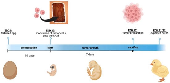 Schematic depiction of the chorioallantoic membrane (CAM) assay. Timeline of the in ovo chorioallantoic membrane (CAM) tumor cell graft model. Fertilized chicken eggs were incubated for 10 days. On embryonic development day (EDD) 10, the eggs were opened, and tumor cells were inoculated onto the CAM. On EDD 17, four days before hatching, the tumors were harvested and analyzed. The figure was created with BioRender© at https://www.biorender.com (accessed on 31 October 2023).