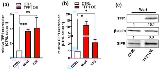Previous investigations by our group revealed that the G protein-coupled receptor (GPCR) GIPR is one of the genes with the highest fold change in expression after TFF1 overexpression in RB cells. First, we verified GIPR upregulation upon successful lentiviral TFF1 overexpression (Figure 2a,c) in the RB cell lines Weri and Y79 in terms of the RNA level by Real-Time PCR (Figure 2b). In terms of the protein level, GIPR expression was, however, only significantly upregulated in Weri RB cells, as revealed by a Western blot analysis (Figure 2c). The uncropped blots and molecular weight markers are shown in Supplementary Figure S2.