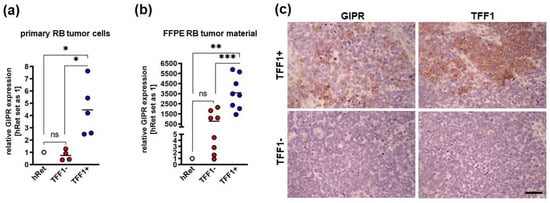GIPR expression in TFF1-negative and TFF1-positive primary RB patient tumors. (a) Cultured TFF1-negative (TFF1-) patient-derived retinoblastoma (RB) tumor cells display similar GIPR mRNA levels to healthy human retina (hRet) as revealed by Real-Time PCR. By contrast, TFF1-positive (TFF1+) RB tumor cells show significantly increased GIPR expression. GIPR expression in TFF1+ primary RB tumor cells is significantly increased compared to TFF1- tumor cells. (b) Real-Time PCR analyses with RNA extracted from formalin-fixed paraffin-embedded (FFPE) RB patient tumors revealed that TFF1-RB tumors show higher, yet not significantly increased, GIPR mRNA levels compared to hRet, whereas TFF1+ tumors display significantly increased GIPR expression compared to hRet and TFF1-RB tumors. (c) Exemplary immunohistochemical stains against GIPR and TFF1 (brown) in TFF1+ and TFF1- in hematoxylin counterstained (blue) paraffin sections of RB patient tumors. Scale bar: 50 µm; applies to all pictures in C. Values represent the means ± SEM; significances are calculated by an unpaired Student’s t-test. ns = p > 0.05; * p < 0.05; ** p < 0.01; and *** p < 0.001.