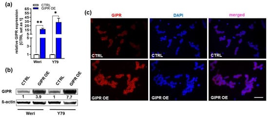 Verification of GIPR overexpression in retinoblastoma cell lines. (a) Verification of GIPR overexpression (OE) in the retinoblastoma (RB) cell lines Weri and Y79 on mRNA level via Real-Time PCR. (b) Verification of GIPR overexpression at the protein level via Western blot analysis in the RB cell lines Weri and Y79. (c) Immunofluorescent stains against GIPR (red fluorescence) with DAPI (blue) counterstaining after GIPR overexpression in Weri RB cells. Scale bar: 50 µm (applies to all pictures in (c). CTRL = cells transduced with control vector; GIPR OE = GIPR overexpression. Values represent the means ± SEM; significances are calculated by an unpaired Student’s t-test. * p < 0.05; ** p < 0.01.