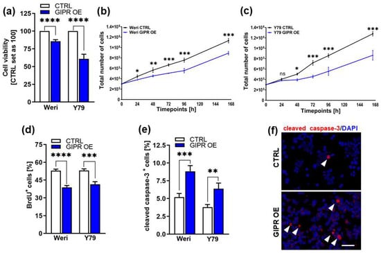 In vitro effects of GIPR overexpression in retinoblastoma cell lines. (a) Cell viability was significantly decreased following GIPR overexpression (GIPR OE; blue bars) in the retinoblastoma (RB) cell lines Weri and Y79, as revealed by WST-1 assays. (b,c) Growth kinetics of Weri (b) and Y79 (c) RB cells were significantly decreased after GIPR overexpression. (d) Proliferation of Weri and Y79 cells was significantly decreased after GIPR overexpression, as revealed by the quantification of BrdU stains. (e) The significant increase in apoptosis after GIPR overexpression in Weri and Y79 cells was caspase-3-dependent, as revealed by the quantification of immunocytochemical stains against cleaved caspase-3. (f) Immunocytochemical stains against cleaved caspase-3 in Weri control cells (CTRL) and GIPR-overexpressing (GIPR OE) Weri cells. Arrowheads indicate cleaved caspase-3-positive (cleaved caspase-3+) cells. Scale bar 50 µm. CTRL = cells transduced with control vector. Values represent the means ± SEM; significances were calculated by an unpaired Student’s t-test. ns = p > 0.05; * p < 0.05; ** p < 0.01; *** p < 0.001; and **** p < 0.0001.