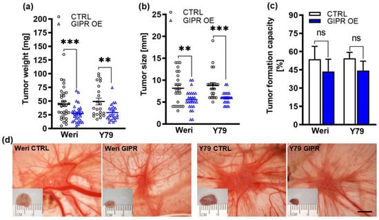 Next, we used the chicken chorioallantoic membrane (CAM) assay to examine the impact of GIPR overexpression on RB cell tumor growth and formation capacity in an in vivo model (for the schematic depiction, see Figure 1). Stably GIPR-overexpressing Weri and Y79 cells were inoculated into the CAM of 10-day-old chicken embryos. The quantification of CAM tumor weight and size revealed that both GIPR-overexpressing RB cell lines investigated formed significantly lighter and smaller tumors in ovo than the control cells (Figure 6a,b,d). Compared to the controls, the tumor formation capacity was not significantly changed in the GIPR-overexpressing Weri and Y79 cells (Figure 6c).