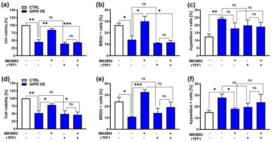 Effects of administration of a GIPR inhibitor and recombinant TFF1 on GIPR-overexpressing RB cells. (a,d) Cell viability was significantly decreased following GIPR overexpression (GIPR OE; blue bars) in the retinoblastoma (RB) cell lines Weri (a) and Y79 (d), as revealed by WST-1 assays after 24 h. After the administration of the GIPR inhibitor MK0893, the effect was reversed. The addition (+) of recombinant TFF1 (rTFF1) or a combination of MK0893 and rTFF1 did not lead to changes in cell viability compared to untreated GIPR-overexpressing cells (−). (b,e) Cell proliferation in Weri (b) as well as in Y79 (c) cells was decreased after GIPR overexpression, as revealed by the quantification of BrdU stains. Following the administration of MK0893, the effect was reversed, and the proliferation levels exceeded those of the control cells, transduced with a control vector (CTRL). The addition of rTFF1 did not lead to changes in proliferation compared to the untreated GIPR-overexpressing cells. (c,f) Changes in the cell death levels after GIPR overexpression were revealed by the counting of trypan blue-positive cells. GIPR overexpression resulted in an increased apoptosis level of Weri (c) and Y79 (f) cells. Following the administration of MK0893, the cell death levels dropped significantly in Y79 (f) but not in the Weri cell line. The addition of rTFF1 did not lead to significant changes compared to the cell death levels of the untreated controls. The legends in a and d also apply to all the other graphs. Values represent the means ± SEM; significances are calculated by an unpaired Student’s t-test. ns = p > 0.05; * p < 0.05; ** p < 0.01; and *** p < 0.001.