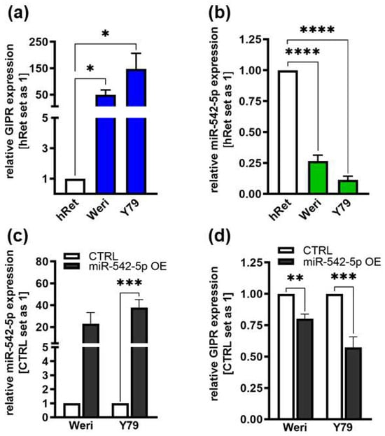 Endogenous GIPR and miR-542-5p expression levels in RB cell lines and expression after miR-542-5p overexpression. (a,b) Compared to healthy human retina (hRet), the RB cell lines Weri and Y79 displayed increased GIPR ((a); blue bars) and decreased miR-542-5p ((b); green bars) mRNA expression levels, as revealed by Real-Time PCR. (c,d) After successful miR-542-5p overexpression (grey bars; (c)), verified by Real-Time PCR, the RB cell lines displayed significantly decreased GIPR mRNA expression levels (d). CTRL = cells transduced with control vector. miR-542-5p OE = miR-542-5p overexpression. Values represent the means ± SEM; non-significant p-values are not shown. * p < 0.05; ** p < 0.01; *** p < 0.001; and **** p < 0.0001.