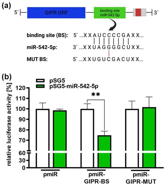 Binding studies of miR-542-5p to the 3′-UTR region of GIPR. (a) Depiction of potential binding sites of miR-542-5p at the 3′-UTR region of the GIPR gene. The GIPR 3′-UTR region contains a potential binding site for miR-542-5p adjacent to the open reading frame (GIPR ORF). MiR-542-5p can bind to the potential binding site (BS), whereas it cannot bind to the mutant binding site (MUT BS). (b) For the luciferase binding studies, HEK293T cells were co-transfected with a miR-542-5p expression vector (pSG5-miR542-5p) in addition to either a wildtype (pmiR-GIPR-BS) or mutant (pmiR-GIPR-MUT) vector containing the binding sequence of the GIPR 3′-UTR. Empty vectors (pSG5 and pmiR) served as the controls. After 48 h, decreased luciferase activity indicated the binding of miR-542-5p to the 3‘-UTR of the GIPR gene (pmiR-GIPR-BS). No binding was observed for the mutant GIPR binding site (pmiR-GIPR-MUT). The values are the means of at least three independent experiments ± SEM; significances are calculated by an unpaired Student’s t-test. Non-significant p-value calculations are not shown. ** p < 0.01. The figure was created with BioRender© at https://www.biorender.com (accessed on 31 October 2023).