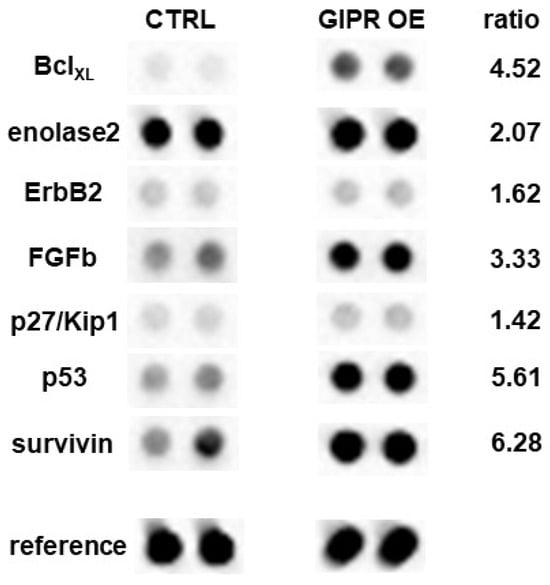 The expression levels of 84 human cancer-related proteins were evaluated in Weri cells transduced with either GIPR or control lentiviral supernatant using the Proteome Profiler Human XL Oncology Array (R&D Systems, Minneapolis, MN, USA). The expression levels were determined in duplicate, using 200 µg of protein following the manufacturer’s protocol.