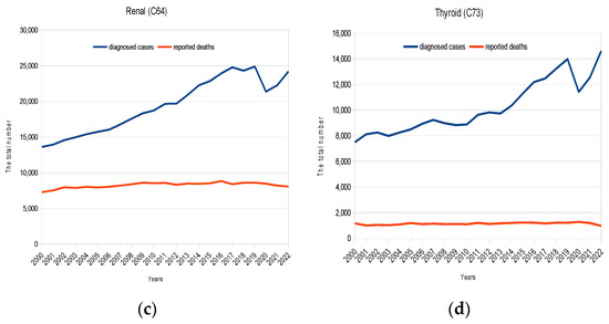 Cancer incidence and mortality in Russia from 2000 to 2022: (a) breast; (b) prostate; (c) renal; (d) thyroid. The total numbers of newly diagnosed cases are plotted in blue; reported deaths are shown in orange.