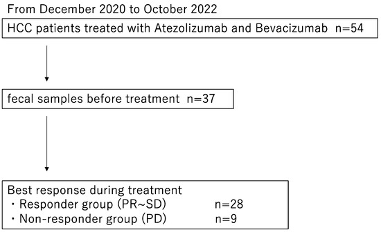 During the study period, a total of 54 patients received the combination therapy of atezolizumab and bevacizumab at our hospital. Out of these, 37 patients agreed to participate in the study and provided pre-treatment fecal samples. Of these 37 patients, 28 were categorized as responders (11 patients with PR and 17 patients with SD) and 9 were categorized as non-responders (Figure 1).