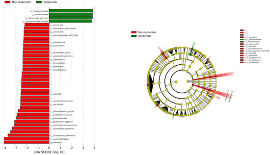 The graph shows a comparison of the relative abundance of bacterial communities between both groups performed with LEfSe. Green bars show bacterial communities with a higher relative abundance in the responder group, and red bars represent bacterial communities that were more abundant in the non-responder group. LEfSe, Linear Discriminant Analysis Effect Size.