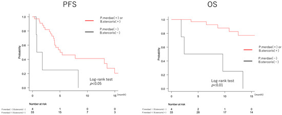 The upper graphs show a comparison of PFS and OS in the group with and without Bacteroides stercoris. PFS was significantly longer in the group with Bacteroides stercoris, and OS tended to be longer. The lower graphs show a comparison of PFS and OS in the group with and without Parabacteroides merdae. Both tended to be longer in the group with Parabacteroides merdae.
