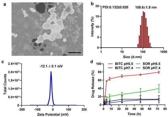 Characterization of BITC−SOR−NPs. (a) SEM image of BITC−SOR−NPs. Scale bar, 200 nm. (b) Size distribution and Polydispersity index (PDI) of BITC−SOR−NPs measured by dynamic light scattering. (c) Zeta potential of BITC−SOR−NPs. (d) Release profiles of BITC and SOR at pH 5.5 or 7.4.