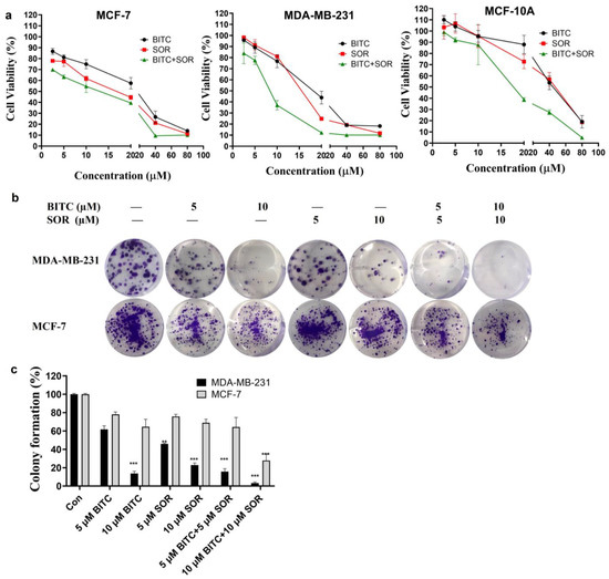The effects of BITC and SOR alone and in combination treatment on cell breast cancer cell survival were examined using a pair of well-characterized human breast cancer cell lines (MDA-MB-231 and MCF-7) as models. The MCF-7 cell line, which was isolated from a pleural effusion of stage IV invasive ductal carcinoma, is estrogen receptor (ER)-positive and estrogen-responsive. The MDA-MB-231 cell line is a triple-negative model, which does not express ER, progesterone receptor (PR), and does not have Human Epidermal Growth Factor Receptor 2 (HER-2)/Neu amplification. The MCF-7 cells are aneuploid with high chromosomal instability and partially defective for the G1 and mitotic spindle checkpoint but express normal p53, while MDA-MB-231 cells are partially proficient for all cell cycle checkpoints and express mutant p53 [58]. Selective growth inhibition toward cancer cells is a highly desirable feature of potential cancer preventive and therapeutic agents. In this study, the normal breast cell line MCF-10A was also selected for comparison to determine the antitumor specificity of BITC and SOR on tumor cells. The cell survival of all three cell lines was determined by the MTT cell viability assay, and the results are summarized in Figure 2. Breast cancer MCF-7, MDA-MB-231, and normal breast cells (MCF-10A) were treated with different doses of the drug alone or in combination for 24 h. As shown in Figure 2a, after 24 h treatment, the IC50 of BITC and SOR on MDA-MB 231 cells were 18.65 µM and 15.37 µM, respectively. The IC50 of MCF-7 cells after BITC and SOR treatment were 21.00 µM and 14.25 µM, respectively. These results showed that BITC and SOR alone or in combination inhibited the proliferation of breast cancer cells in a dose-dependent manner. The IC50 of MCF-10A was 43.24 µM and 41.02 µM for BITC and SOR treatment, respectively, after 24 h of incubation, both of which were higher than that of the tumor cell line. MCF-10A was more resistant to growth inhibition by BITC and SOR compared with MDA-MB-231 or MCF-7 cells. Collectively, these results indicated that the human breast cancer cells were significantly more sensitive to growth suppression by BITC and SOR compared with a normal mammary epithelial cell line. Furthermore, we found that the SOR and BITC combination significantly inhibited the viability of both MCF-7 and MDA-MB-231 cells (Figure 2a). BITC largely improved the chemosensitivity of SOR with an IC50 of 8.06 μM for the BITC+SOR group in MDA-MB-231 cells.