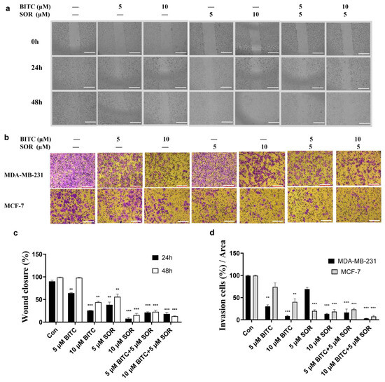 A Matrigel-coated Transwell assay was used to investigate the ability of BITC and SOR to inhibit cancer cell invasion. Both MDA-MB-231 and MCF-7 cells were treated with different concentrations of BITC and SOR. Results showed that cell invasion was decreased in a dose-dependent manner (Figure 3b,d). The 10 µM BITC or SOR alone significantly reduced cancer cell invasion vs. the control group in both cell lines. Among all treatment groups, the 5 µM SOR and 10 µM BITC combination was the most effective group, which agreed with the migration assay. The result showed that the combination of low concentration of BITC and SOR can achieve the same inhibition efficacy as high concentration of SOR treatment, which indicates that the combination of BITC and SOR can reduce the dose of SOR administration. It is also interesting to see that cell invasion was reduced more in MDA-MB-231 by BITC treatment, while SOR inhibited more of the MCF-7 cell invasion. These results indicate that different subtypes of breast cancer might respond differently to BITC and SOR.