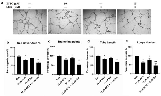 In vitro endothelial tube formation assays provide a model for studying the differentiation and modulation of endothelial tube formation by potential anticancer agents. To investigate the pro-angiogenic effects of BITC and/or SOR, a tube formation assay was performed using HUVECs to observe vascular network formation. The results showed that at 16 hours, all four network characters, including cell cover area, total branching point, total tube length, and loop number (Figure 4) by conditioned media obtained from 10 µM BITC treatment, were significantly longer than those in the control group. Although the cell cover area and total tube length in the 10 µM SOR conditioned media group were lower than that in the control group, there was no statistical difference between them. The combined treatment of BITC and SOR is most effective in reducing the number of branching points and loops by 50% compared to the control.