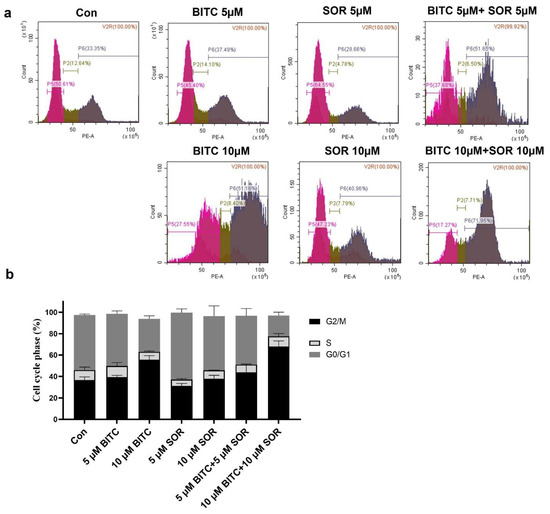 Effects of BITC and SOR combined treatment on MDA-MB-231 cell cycle: (a) Flow cytometry analysis of the cell cycle distribution after 24 h of treatment with BITC and/or SOR; (b) Quantitative evaluation of cells arrested at G2. Data are presented as means ± SD (n = 3).