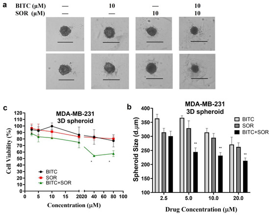 Effects of BITC and SOR combined treatment on MDA-MB-231 spheroids: (a) MDA-MB-231 cells were seeded for spheroid generation, and brightfield images of spheroids after 48 h BITC and/or SOR treatments were captured using an EVOS M5000 microscope under 4× magnification (Scale bar denotes 500 μm); (b) Size comparison of MDA-MB-231 spheroids measured by ImageJ and expressed as the diameter of the Spheroid; (c) The cell viability of MDA-MB-231 spheroids was measured by resazurin reduction assay. Data are presented as means ± SD (n = 3). Statistical significance is denoted as * p < 0.05, ** p < 0.01, compared to the control group, which was treated with 0.1% DMSO.