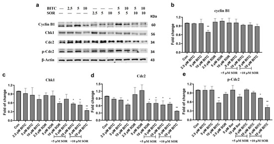 The combination of BITC and Sorafenib induced cell cycle arrest by inhibiting cyclin B1, Chk1, and Cdc2. To investigate the mechanism of BITC and SOR-mediated cell cycle arrest, we examined their effects on levels of protein expression associated with G2 phase regulation, including cyclin B1, Cdc2, which is also known as Cyclin Dependent Kinase 1 (CDK1), and Chk1, using Western blotting, as shown in Figure 7 (MDA-MB-231) and Figure S4 (MCF-7). As shown in Figure 7, cyclin B1 expression was only significantly down-regulated in MDA-MB-231 by 10 µM BITC treatment. However, in MCF-7 cells, cyclin B1 expression was significantly down-regulated by both SOR treatment alone and BITC+SOR combination treatment. In MDA-MB-231 cells, both Cdc2 and Chk1 expression was significantly down-regulated by the combination treatment. BITC (5 μM) or SOR (5 μM) alone did not produce a significant effect on the expression of Cdc2, but BITC (5 μM) + SOR (5 μM) could suppress Cdc2 expression to 30%. A similar trend was seen in the combination treatment inhibition of Chk1 expression in both MDA-MB-231 and MCF-7 cells. Phosphorylated Cdc2 was significantly down-regulated by 10 μM BITC alone or BITC and SOR combinations in MDA-MB-231 cells, while MCF-7 seems more sensitive towards BITC and SOR treatment as BITC (5 μM) + SOR (5 μM) could suppress the level of phosphorylated Cdc2 to 30%.