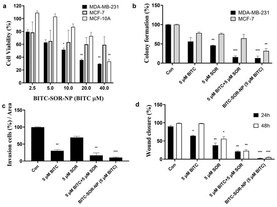 Effects of BITC–SOR-NPs treatment on breast cancer cell lines: (a) Cytotoxicity of MDA-MB-231, MCF-7, and MCF-10A cells after different treatments for 24 h; (b) Colony formation of MDA-MB-231, MCF-7, and MCF-10A cells after different treatments for 24 h; (c) The quantitative results of invasion assay for MDA-MB-231 cells after different treatments for 24 h; (d) Migration study of MDA-MB-231 cells after different treatments for 24 h (quantitative results from wound-healing assay). Data are presented as means ± SD (n = 3). Statistical significance is denoted as * p < 0.05, ** p < 0.01, *** p < 0.001, compared to the control group.