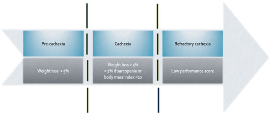 - Evans, W.J.; Morley, J.E.; Argilés, J.; Bales, C.; Baracos, V.; Guttridge, D.; Jatoi, A.; Kalantar-Zadeh, K.; Lochs, H.; Mantovani, G.; et al. Cachexia: A new definition. Clin. Nutr. 2008, 27, 793–799. [Google Scholar] [CrossRef] [PubMed]