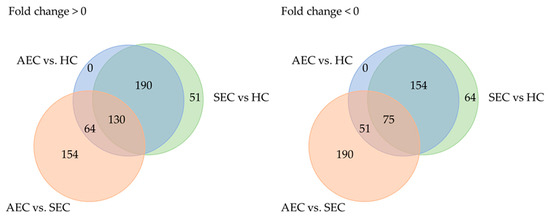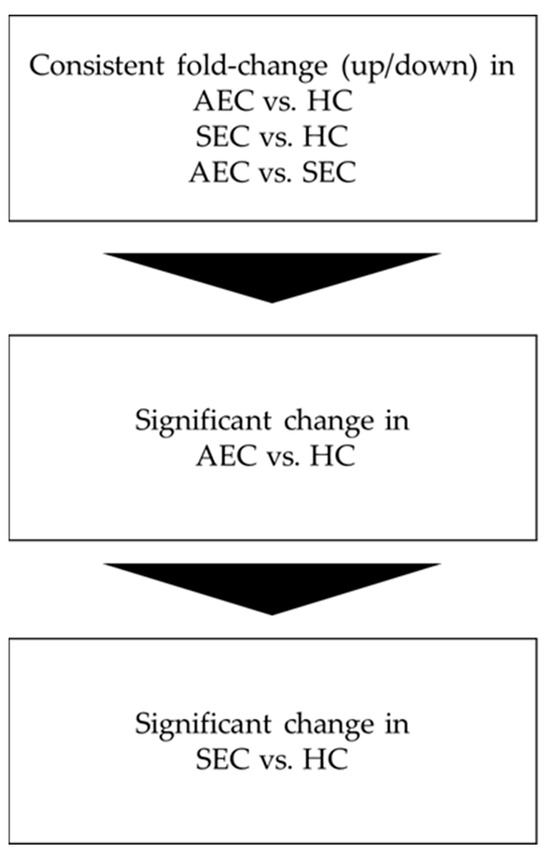 For the comparison of mean values between the two groups, the Mann–Whitney U-test was conducted to test statistical significance. A p-value < 5% was considered statistically significant unless otherwise mentioned. The log2 fold-change value was calculated as the difference of the group-wise mean of the expression values between the two groups. Cohen’s d value was used for the effect size between the two groups.