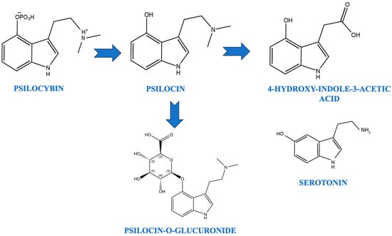 Psilocin, the active metabolite of psilocybin, has been shown to increase the concentrations of dopamine and serotonin in specific brain pathways [58,59]. These compounds are structurally similar to serotonin, with slight chemical modifications that lead to hallucinogenic effects [60]. Psilocybin is dephosphorylated in vivo to form psilocin, which is responsible for its psychoactive effects [59]. Psilocin is metabolized through oxidative deamination to form 4-hydroxy-3-indoleacetic acid and psilocin-O-glucuronide [61].