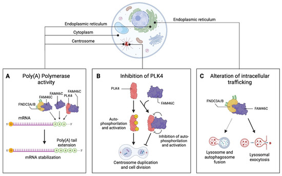 Proposed FAM46C functional models. (A) Poly(A) polymerase model, (B) PLK4 inhibitor model and (C) regulator of intracellular trafficking dynamics model. Image created with BioRender, https://www.biorender.com/ accessed on 15 April 2024.