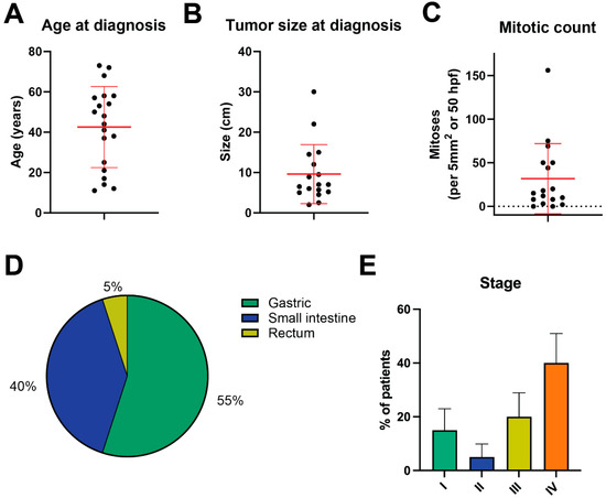 Clinical characteristics and outcomes in triple-negative GIST. (A) Distribution of age at diagnosis. (B) Distribution of tumor size at diagnosis. (C) Distribution of mitotic count from original biopsy or resected specimen. In (A–C), bars represent means ± SD. (D) Anatomic distribution of triple-negative GIST cases. (E) On the left in colored bars are the initial disease stage. Black and gray bars on the right indicate the percent of patients that remained with localized disease versus those that developed recurrent or metastatic disease. Bars represent percentages plus standard error of proportion.
