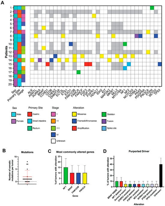 This is a retrospective study of all patients treated at MD Anderson between 1 January 2015 and 31 December 2023 with a diagnosis of GIST and available clinical next-generation sequencing data. We included those that lacked alterations in KIT and PDGFRA and either (1) retained expression of SDHB by immunohistochemistry (15 patients) or (2) had wild-type SDHB according to a sequencing assay (5 patients had only SDH mutation testing and not SDHB immunohistochemistry). The following clinical data were collected by retrospective chart review: age, gender, race, ethnicity, date of birth, date of diagnosis, vital status, tumor grade, tumor mitotic rate, tumor stage, surgery date, systemic therapies and dates of treatment, response to treatment, personal history of cancer, family history of cancer, and results of next generation sequencing tests. Response to treatment was based on the treating clinician’s documentation in the patients’ charts.