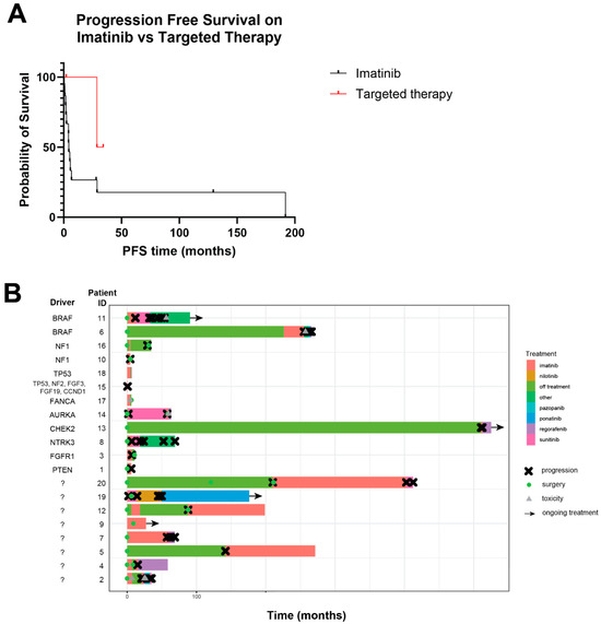 We next looked at whether the specific driver mutation was associated with differences in outcomes. The two patients in our cohort with TP53 mutation had notably worse outcomes. One patient had OS of 3.7 and PFS of 1.1 months on imatinib, while the second patient had OS of 7.9 months and PFS of 3.8 months on imatinib. In the patients with the best outcomes (either no recurrence/progression or recurrence/progression 5 years or more after diagnosis, n = 8), there was no obvious association with genomic driver; one with FGFR1 GOF mutation, one with BRAF GOF mutation, one with CHEK2 LOF mutation, one with FANCA deletion, and the remaining four without identified drivers.