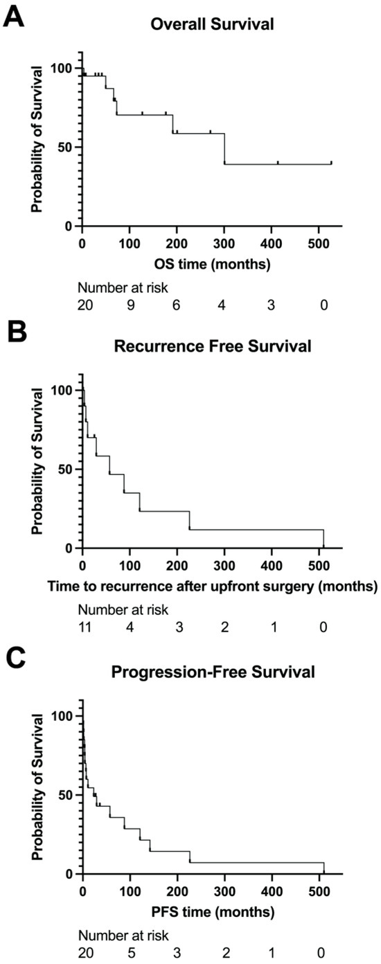 Follow-up data were available for a median of 66.4 months from the time of diagnosis, which was defined as the date of pathologic confirmation of GIST. Regarding clinical outcomes, the median OS was 301.2 months (Figure 4A). For the 11 patients initially treated with curative intent, the median recurrence-free survival was 57.4 months (Figure 4B). For the 10 patients with localized disease initially that later developed recurrent/metastatic disease, the median time to recurrence/metastasis from the initiation of treatment was 43.3 months (range 1.1–509.9 months, mean 105.4 months). For patients with advanced/metastatic disease, the median PFS with first-line systemic treatment was 23.1 months (Figure 4C). The median OS for patients that presented with de novo metastatic disease (i.e., stage IV) was 66.8 months, and the median OS for patients that ever developed metastatic disease was 301 months.