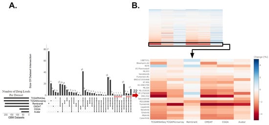 Drug candidates identified for GBM relative to non-HGG (CGGA-LGG and NPC). (A) Upset plot displaying intersections of drugs predicted to be efficacious for GBM relative to non-high-grade glioma (non-HGG) across six GBM datasets. These drugs had a Hodges–Lehmann estimate (HLE) within the top 50% of drugs with an FDR-corrected p-value of ≤0.05. The asterisk indicates 22 drugs that were predicted as efficacious in more than half of the clinical datasets against CGGA-LGG and validated in the avatar dataset, which included MEK inhibitors selumetinib, PD318088, and trametinib. (B) The top panel heatmap displays the standardized HLE for all drugs identified to have a significantly different drug response across GBM and non-HGG samples. The bottom panel heatmap displays the HLE specifically for the 22 drug leads. Drugs predicted to be more efficacious for GBM are darker, in red. Those more efficacious for non-HGG are lighter, in blue.