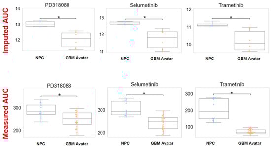 Imputed vs. measured drug response of MEK inhibitors (MEKis) across glioblastoma (GBM) avatar and control samples. Top row: Predicted drug sensitivity scores for three MEKis (PD318088, selumetinib, trametinib) obtained from oncoPredict. AUC (area under the dose–response curve) was predicted for neural progenitor cells (NPCs) and GBM samples for three MEKis. The asterisk indicates statistical significance (FDR p-value < 0.05) Bottom row: Measured drug response by exposing GBM avatar or NPC cells to each MEKi separately with increasing concentrations (across a range of 0.015 nM–100 nM for the drug). AUC was calculated using area under the dose–response curve after CellTiter experiments. For both imputed and measured scenarios, AUC across GBM and NPC samples were compared using a Wilcoxon sum rank test. The asterisk indicates statistical significance between NPC and GBM samples. For imputed drug response, the p-value was 0.006, 0.01, and 0.02 for PD318088, selumetinib, and trametinib, respectively. For measured drug response, p < 0.001. To ensure the accuracy and the reliability of the CellTiter experiments, four biological replicates with six technical replicates within each experiment were measured to minimize the variability and to ensure the accuracy.