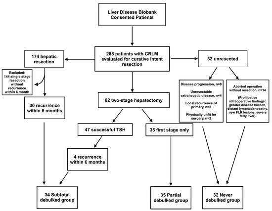 During the study period, 288 patients with CRLM evaluated for curative intent resection were identified from the liver disease Biobank (Figure 1). Of these, 174 patients underwent a single-stage partial hepatectomy, of which 30 patients developed early recurrence (defined as liver recurrence within 6 months of hepatic resection). TSH was attempted in 82 patients. TSH was successfully completed in 47 patients (57%), with 4 patients developing early recurrence, while 35 patients (43%) underwent the first stage only. Reasons for failed TSH included tumor progression, new lesions in the FLR, insufficient growth of the FLR, or patient deconditioning. Thirty-two patients did not undergo any liver resection due to the progression of disease on best chemotherapy (n = 8), unresectable extrahepatic disease (n = 4), local recurrence of primary (n = 2), or deconditioning due to chemotherapy (n = 2). There were 14 patients who had an aborted liver resection after exploration revealed prohibitive intraoperative findings (i.e., greater than anticipated disease burden, distant lymphadenopathy, new lesions in the FLR, or severe fatty infiltration of the liver).