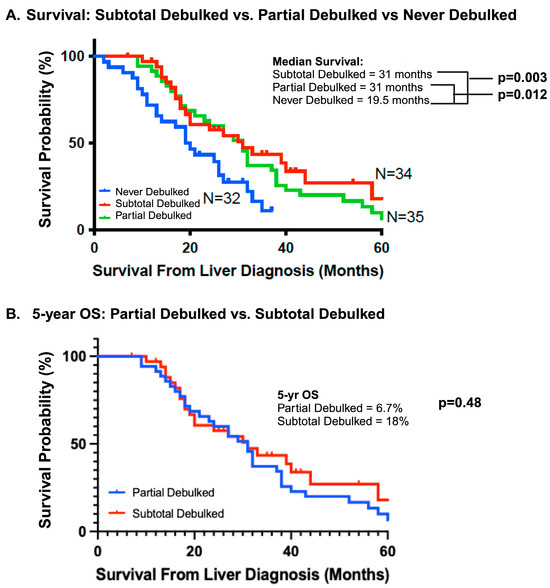 The patient demographics and characteristics are summarized in Table 1 and were similar across the three groups. There was no difference in baseline CEA, the location of the primary tumor, the location of liver lesions, or the size of the largest liver lesion between the groups. More than 70% of patients in each group presented with a synchronous disease. The subtotal debulked group had significantly fewer liver lesions compared to the partial and never debulked groups (three lesions (range: 1–6), vs. five lesions (range: 1–9), vs. four lesions (range: 1–16), respectively; p < 0.001), and there was no difference in number of liver lesions between the partial and never debulked groups (p = 0.99). Additionally, more patients in the subtotal debulked group had unilobar liver lesions (p < 0.001, 95% CI 2.8–26.2), while there was no difference in the location of liver lesions between the partial and never debulked groups (p = 0.35, 95% CI 0.16–1.86). Of the 35 patients in the partial debulked group, 18 patients (51%) had <50% tumor volume resected in the first stage of the failed TSH.