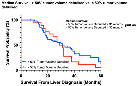 Second, reducing tumor burden may lessen the immunosuppressive effects of the liver tumor mass, enhancing the host immune response against tumor antigens [28]. While mechanistic data supporting this hypothesis are scarce, growing evidence suggests liver metastases convey a tumor-specific immune suppression. Preclinical models demonstrate liver metastasis hinders immunotherapy response by depleting both systemic tumor-specific CD8+ T cells and hepatic-derived macrophage-induced antigen-specific T cell apoptosis [29]. Liver-directed radiotherapy may also reprogram the tumor microenvironment from being immune suppressive to stimulating antitumor immunity [29,30]. It is, therefore, conceivable that surgical debulking may offer the same attenuation in the hepatic immune response. Other studies demonstrate that checkpoint inhibitors work better in patients without liver metastases [31,32]. With this in mind, it is reasonable to hypothesize that a similar transition to an onco-immunostimulatory or a less onco-immunosuppressive environment occurs after tumor debulking surgery.