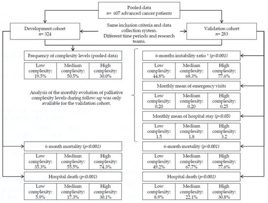 A total of 607 patients with advanced cancer participated in the study, 324 (53.4%) of whom corresponded to the PALCOM development cohort and 283 (46.6%) to the validation cohort. The data of the evolutionary behavior of the model of complexity only corresponded to the validation cohort since these variables were not analyzed monthly in the development cohort. A flow diagram is shown in Figure 1.