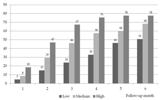 The IR of the patients classified as low complexity in the basal visit was 4.5% in the first month of follow-up, 23.8% before the third month and 50.7% before the sixth month. The IR of the patients classified as having medium complexity in the basal visit was 8.4% in the first month of follow-up, 46.1% before the third month and 68.3% before the sixth month. The IR of the patients classified as having high complexity in the basal visit was 18.4% in the first month of follow-up, 67.3% before the third month and 77.6% before the sixth month. The differences in IR among the different levels of complexity at 6 months of follow-up were highly significant (p < 0.001) (Table 4) (Figure 2). In the comparison of the IR between the cases of medium and low complexity, the odds ratio (OR) was 2.7 (95% CI: 1.48, 4.74), being 1.6 (95% CI 0.76, 3.39) between the cases of high and medium complexity and 4.3 (95% CI: 1.86, 9.73) between those of high and low complexity.