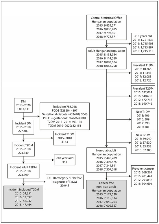 The HCSO collects all health-related data from the entire Hungarian population. Patients younger than 18 years who were diagnosed with prevalent or recent-onset T2DM or T1DM were excluded from the database in each year between 2015 and 2018 (Figure 1). The remaining part of the population represented the non-diabetic adult population of Hungary. The presence of ICD-10 code C was searched to identify incident cancers. In the present analysis, the International Classification of Diseases, 10th Revision (ICD-10) codes between C00 and C99 have been used. The details are given in the supplement (Supplementary Methods).