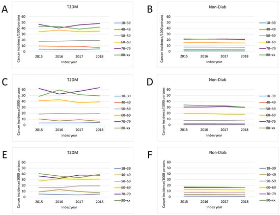 Incidence of developing cancer in different age groups: (A,B) in the total population, (C,D) in male persons, (E,F) in females, (A,C,E) in patients with T2DM. (B,D,F) show data related to the Non-Diab group.